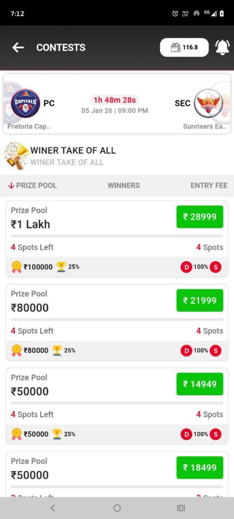 - Multiple Sports Contests – Play fantasy cricket, football, kabaddi, basketball, etc.