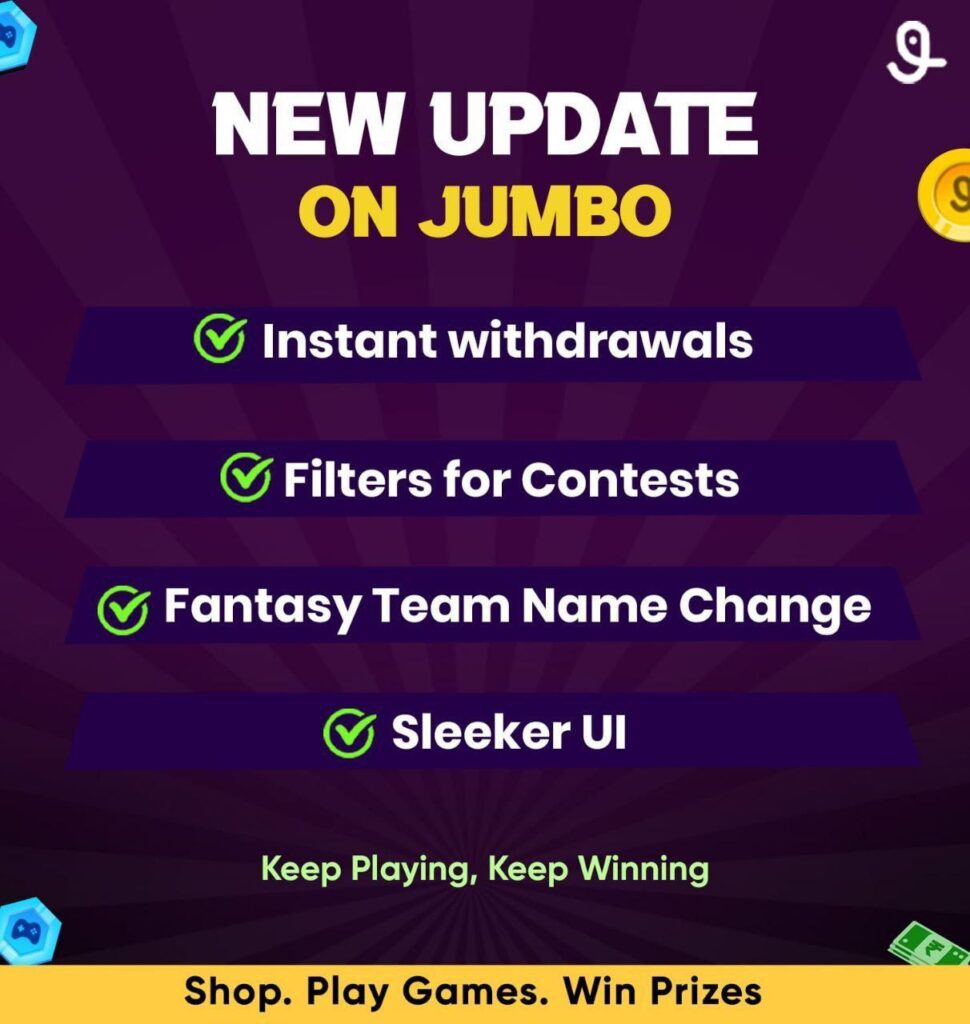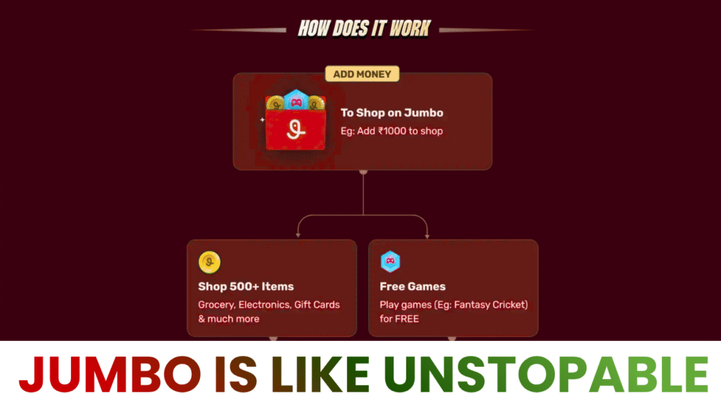 एक तरफ तो आप FANTASY टीम बना सकते हो और दूसरी तरफ आप ONLINE SHOPING भी कर सकते हो.. SHOPING की गयी PRODUCT को आपके घर पर आने में लगभग 20 – 25 दिन का समय लग जाता है।आप चाहे तो JUMBO से MOBILE RECHARGE कर सकते हो… लेकिन महीने में केवल तीन बार ही। .. और इसमें सबसे ख़राब बात है की MAXIMUM आप RS 29 तक की ही रिचार्ज कर सकते हो उससे ज्यादा नहीं कर पाओगे.