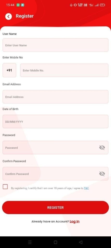 Sabse pehle app open karein aur ‘Register’ par click karein. Yahan apna User Name, Mobile Number, Email Address, aur Date of Birth enter karein. Ek strong password create karein aur use confirm karein. T&C check-box par tick karke ‘Register’ button dabayein.