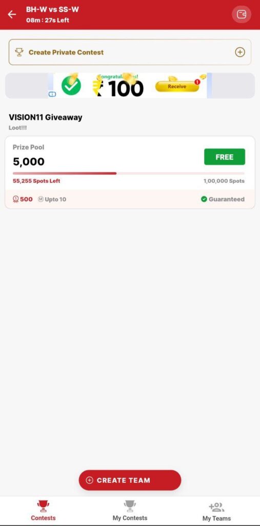 Download the VISION11 App, Select a match, choose inform players in your fantasy team, make C,Vc and save the team select your fav contest which you want to play… and join the leagues.